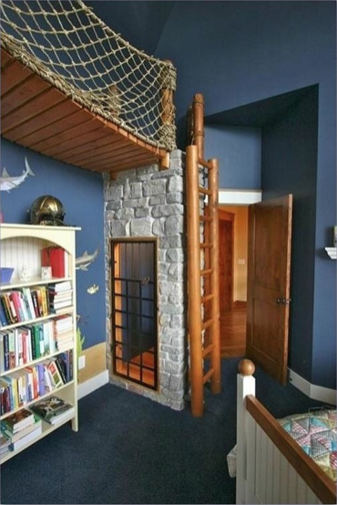 If you thought ladders and bridges were only for outdoor playgrounds, think again. Ladders and bridges make for amazing playrooms. This family has a rope bridge inside the playroom for the children. This bridge lets kids play out their imagined adventures even when they cannot go outside to a playground. What makes this room stand out is the rest of its design. Dark blue on the walls and ceiling and fish painted under the bridge give the impression of playing in an underwater kingdom. This is the perfect room for a budding little Jacques Cousteau, pretend pirate or imaginary mermaid.