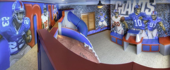 Children’s playrooms can cater to their love of a favorite sport or team. This football fan’s playroom features a larger-than-life football and slides along with wall murals depicting the New York Giants.