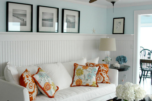 Adding wainscoting to your walls will create nice touch to any coastal interior painted in a crisp white. It creates a ledge for the black and white ocean prints. The use of white furniture creates a crisp look and colorful throw pillows will add a pop of color to the room.