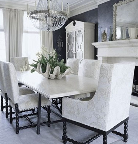 Speaking of center pieces, this giant clam serves as a planter with greenery in this black and white dining room.